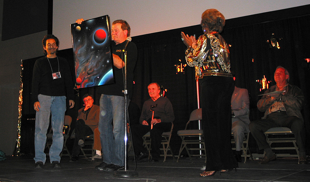 WILLIAM SHATNER PRESENTING MICHAEL'S ORIGINAL PAINTING - THE GREAT BIRD OF THE GALAXY